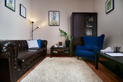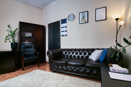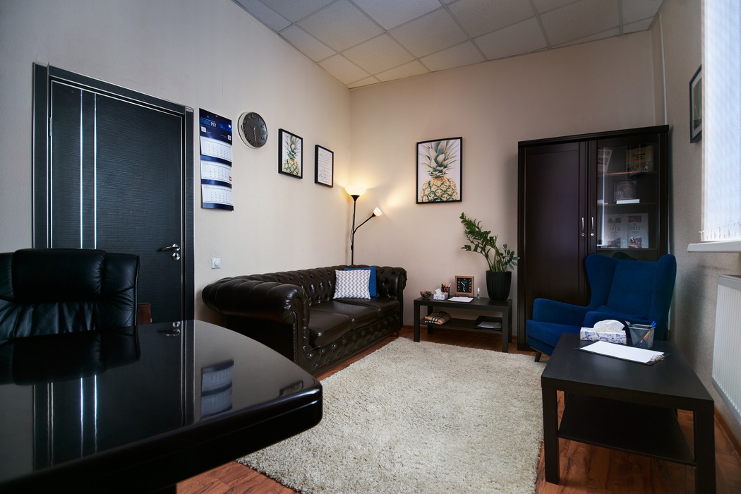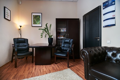 Кабинет в сдержанных тонах, изолирован двойными дверями, имеет хорошую шумоизоляцию, оснащен кожаным диваном (до 3 человек) и мягким уютным креслом, планшетами для бумаги и другими письменными принадлежностями. Также в кабинете и зоне ожидания перед кабинетом есть бумажные салфетки, чай, вода, стаканчики, различные уровни подсветки. Благодаря размеру кабинета и большому количеству растений создается комфортная атмосфера для профессиональной работы.