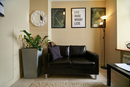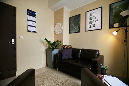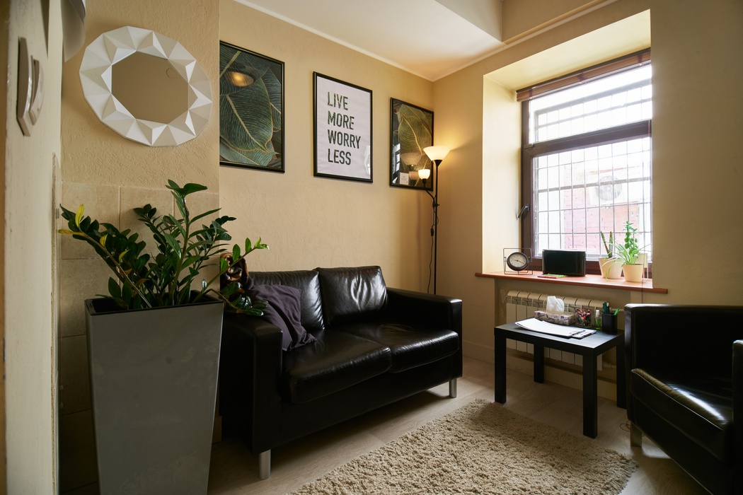 Это небольшой кабинет с приятным, светлым интерьером. Теплый свет наполняет помещение уютом и излучает спокойствие. Мягкая мебель обеспечивает комфорт для проведения консультаций. Нейтральные цвета помещения в сочетании с теплым освещением создают благоприятную атмосферу для сеансов.