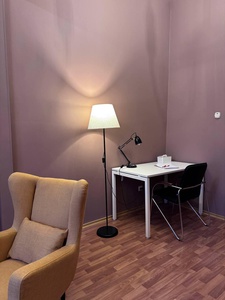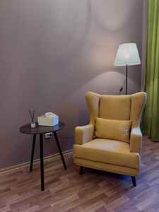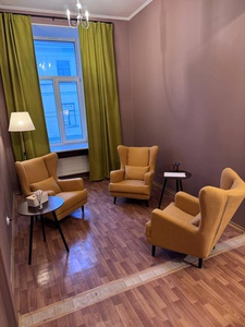 Уютный и просторный кабинет для индивидуальной или семейной психотерапии в горчичной гамме. Пространство продумано для создания атмосферы доверия и спокойствия. Большое окно с зелёными шторами наполняет пространство светом, мягкое освещение создаёт комфортную атмосферу и уют.
