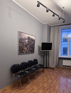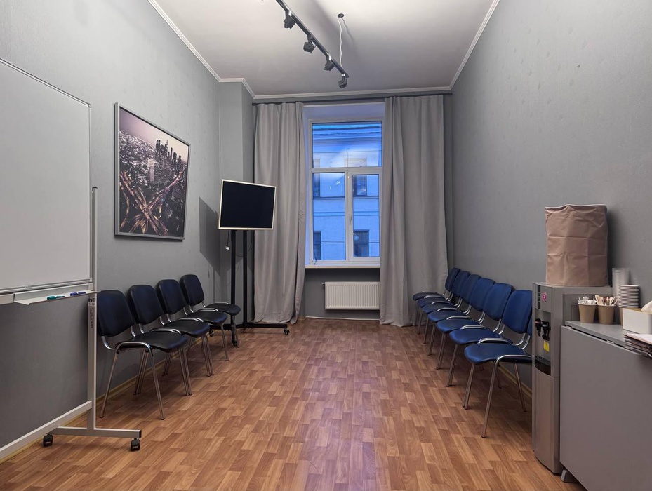 Просторный и функциональный кабинет, идеально подходящий для проведения разноплановой работы, тренингов, семинаров и других групповых мероприятий. Светлые серые стены создают нейтральную, но уютную атмосферу, способствующую концентрации и продуктивной работе.