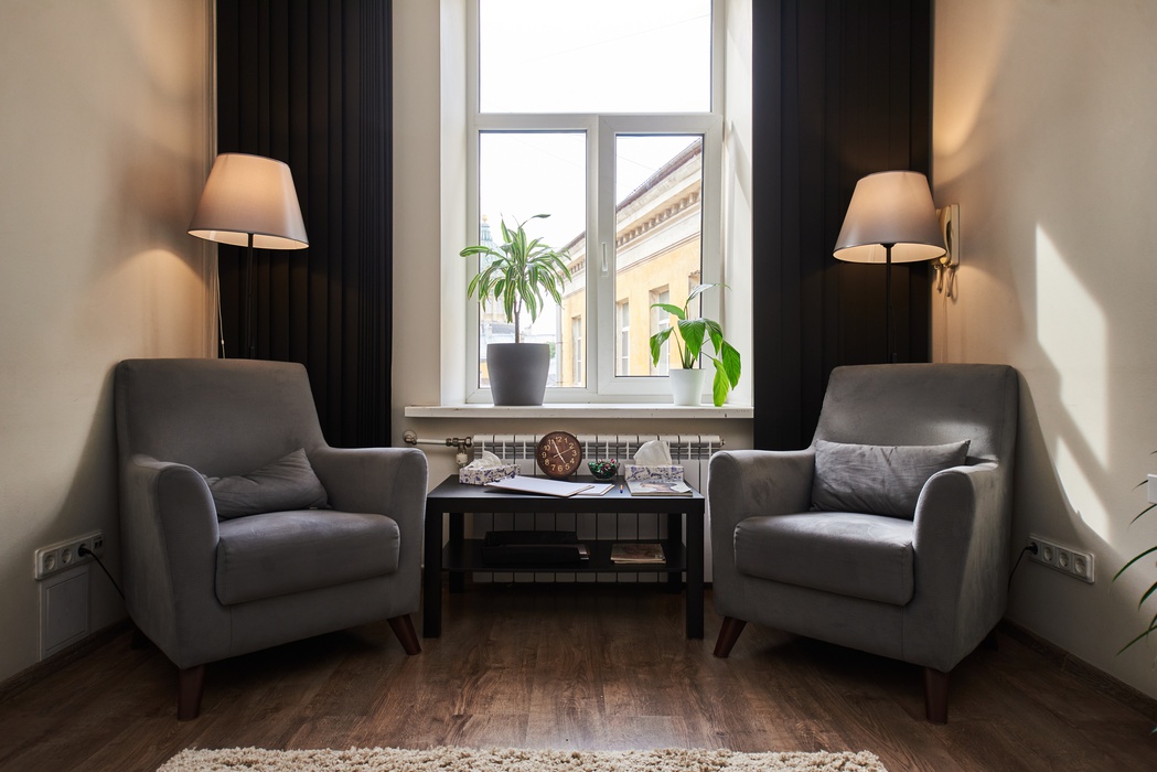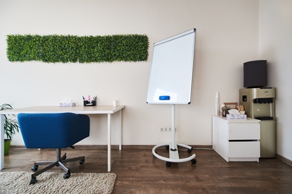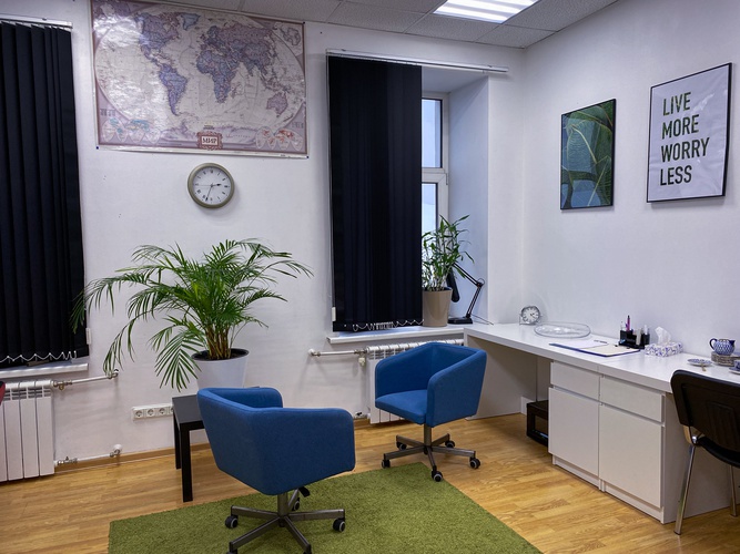 Что есть в кабинете: мягкие новые кресла, стулья, нейтральный стильный декор, журнальный столик, складной стол, кулер с горячей и холодной водой, чайная станция, вешалка, живые растения, большой ковер, планшеты с бумагой, ручки и карандаши, плед и подушки, wi-fi, большое зеркало.