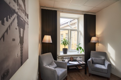 Просторный кабинет в светлых тонах, с видом на Казанский собор, расположенный на 4 этаже студии, оснащен всем необходимым для комфортной разноплановой работы.