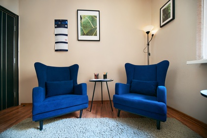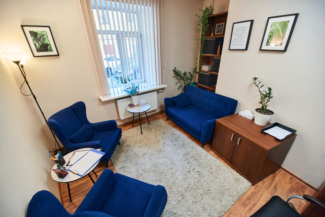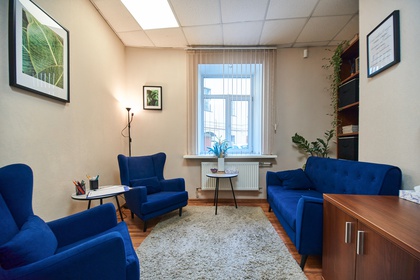 Кабинет в сдержанных тонах, оснащен мягким двухместнм диваном и двумя уютными креслами, планшетами для бумаги и другими письменными принадлежностями, двумя столиками. Благодаря небольшому размеру кабинета и большому количеству растений создается комфортная атмосфера для профессиональной работы. В кабинете есть два источника света - торшер для проведения консультаций и верхний яркий свет для проведения специальной диагностики. Мы внимательно следим за поддержанием чистоты в наших кабинетах и регулярно проводим уборку.