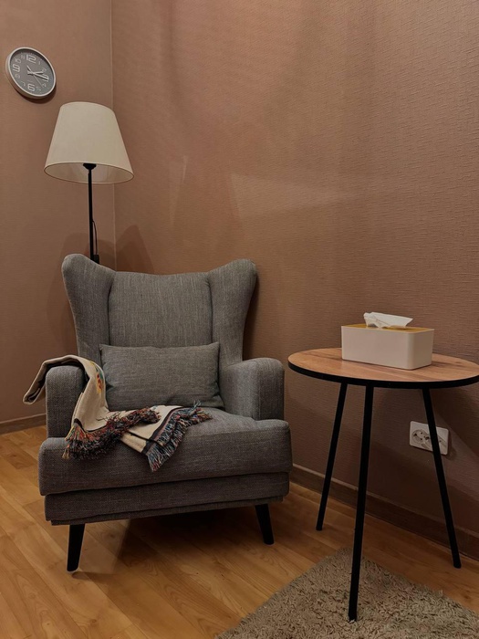 Уютный, компактный кабинет в теплых, бежево-коричневых тонах. Пространство оформлено для спокойной и конфиденциальной беседы — мягкий текстиль, приглушённое освещение и натуральные материалы создают комфортную, защищённую атмосферу. Подходит для индивидуальных консультаций и коротких терапевтических сессий.