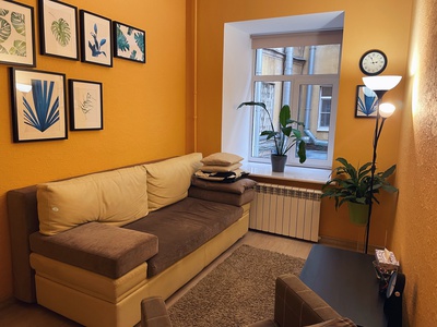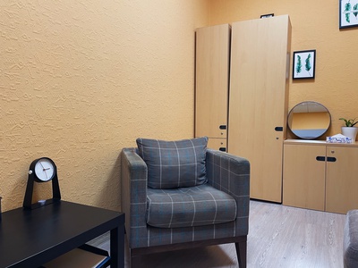 Что есть в кабинете: большой мягкий диван (вместимостью до 3х человек), уютное мягкое кресло, журнальный столик, торшер, настольный светильник, комод, шкаф для одежды, планшеты с бумагой, ручки и карандаши, часы, небольшой мягкий коврик на полу, пледы и подушки, живые цветы.