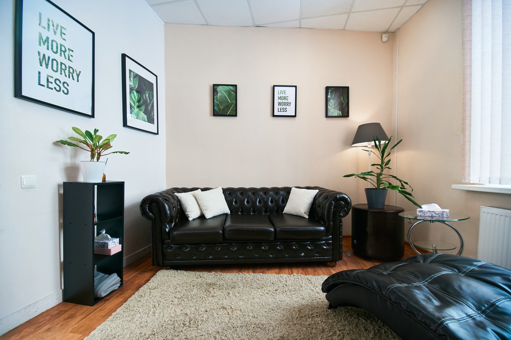 Что есть в кабинете: большой кожаный диван, комфортное кожаное кресло, торшер, настольная лампа, два журнальных столика, аналитическая кушетка, живые растения, книжный шкаф, часы, планшеты с бумагой, ручки и карандаши, плед и подушки.
