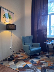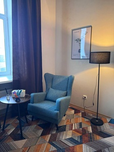 Уютный кабинет для спокойной и бережной работы, отлично подойдёт для индивидуальных консультаций, психологической терапии. Тёплый свет торшера добавляет мягкости пространству, а геометричный ковёр и спокойные оттенки интерьера создают ощущение уюта и стабильности. Большое окно наполняет пространство естественным дневным светом, а плотные тёмные шторы помогают при необходимости сделать атмосферу более камерной и уединённой.