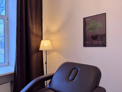 Уютный и функциональный кабинет для сеансов массажа и телесных практик. Светлые тона интерьера создают расслабляющую атмосферу, а продуманное оснащение обеспечивает комфорт как для клиента, так и для специалиста. Большое окно наполняет кабинет естественным светом, а мягкое искусственное освещение позволяет сохранить комфортную атмосферу в любое время дня.