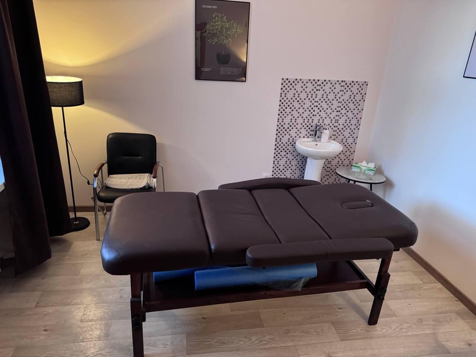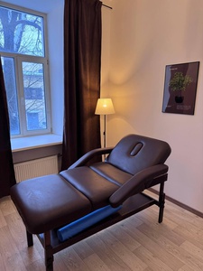 Что есть в кабинете: регулируемый массажный стол с подлокотниками, одноразовые простыни, раковина, мыло для рук, небольшой круглый столик, два напольных светильника с мягким светом, пледы, подушки, два кожаных стула, лоток для обуви, картины с растениями, настенные часы, мусорное ведро, плотные шторы.