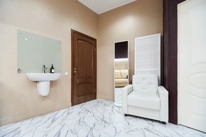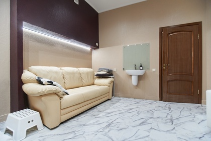 Кабинет оснащен автоматической кушеткой, рукомойником, диваном, стульями, столом среднего размера и канцелярскими принадлежностями. В кабинете проведены шумоизоляционные работы и установлены двойные двери, что позволяет добиться повышенной шумоизоляции. При необходимости в кабинет можно поставить передвижную маркерную доску.