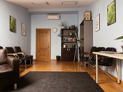 Что есть в кабинете: большой мягкий кожаный диван (вместимостью до 4х человек), мягкое кожаное кресло, письменный стол, планшеты с бумагой, ручки и карандаши, флипчарт с маркерами, часы, два книжных шкафа, стулья, большой ковер на полу, живые цветы, пледы и подушки.