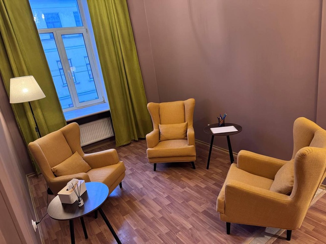 Уютный кабинет в спокойных серо-коричневых тонах, подойдет для индивидуальной и семейной психотерапии. Идеальное пространство для доверительных бесед. Большое окно наполняет кабинет естественным светом, а мягкое искусственное освещение позволяет сохранить комфортную атмосферу в любое время дня. Картины с растениями добавляют интерьеру спокойствие и уют.